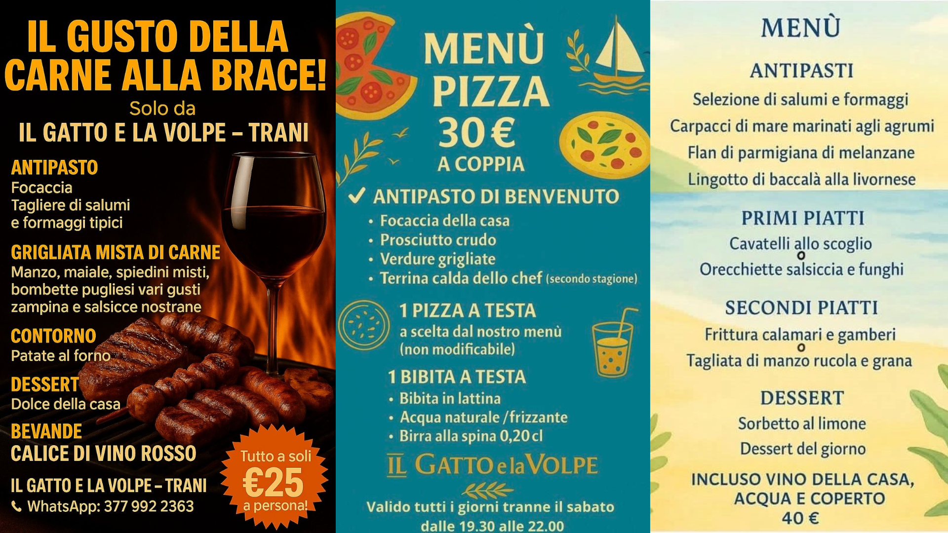 Scopri tutte le nostre proposte: dalle specialità di carne alle pizze fragranti, fino al menù domenicale. C’è sempre qualcosa di gustoso per ogni occasione!